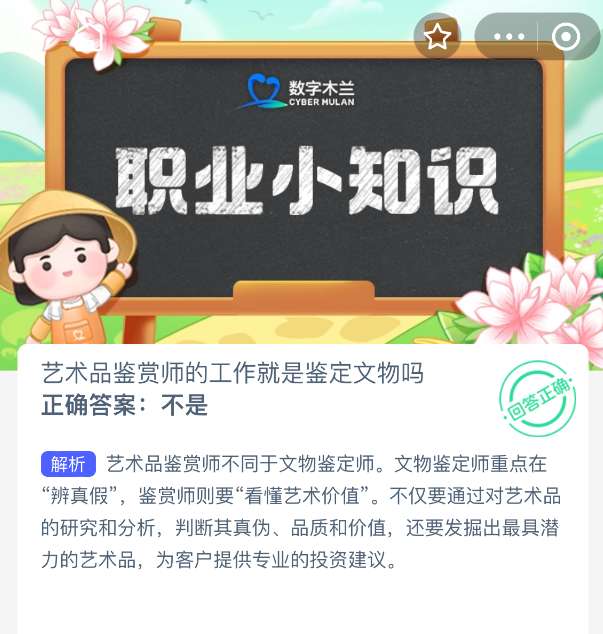 艺术品鉴赏师的工作就是鉴定文物吗?【蚂蚁新村每日一题】2025年10月30日题目已发布!坚持答题,积累木兰币,即可加速小镇建设。答对本题,立即可享“产速+3/时”的加速奖励!今天正确答案是【不是】。艺术品鉴赏师不同于文物鉴定师。文物鉴定师重点在“辨真假”,鉴赏师则要“看懂艺术价值”。