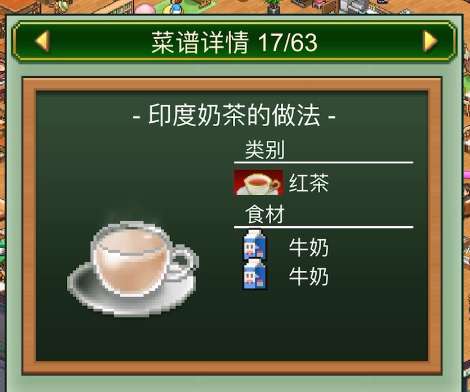 接下来所要分享的食谱就是红茶,红茶也会有多种种类,例如柠檬茶的主要原材料就是柠檬,生姜红茶的原材料那自然就是生姜,如果是印度红茶是两种原材料,分别是牛奶加牛奶。也有一些人会比较喜欢苹果茶,苹果茶是有两种不一样的成分组合在一起,一种是蜂蜜,一种是苹果。如果喜欢冰奶茶,那就比较简单,就只不过是单纯的牛奶。当玩家进入到中期之后,其实热饮料也是一个比较热门的选择。例如抹茶拿铁,还有可可等等。