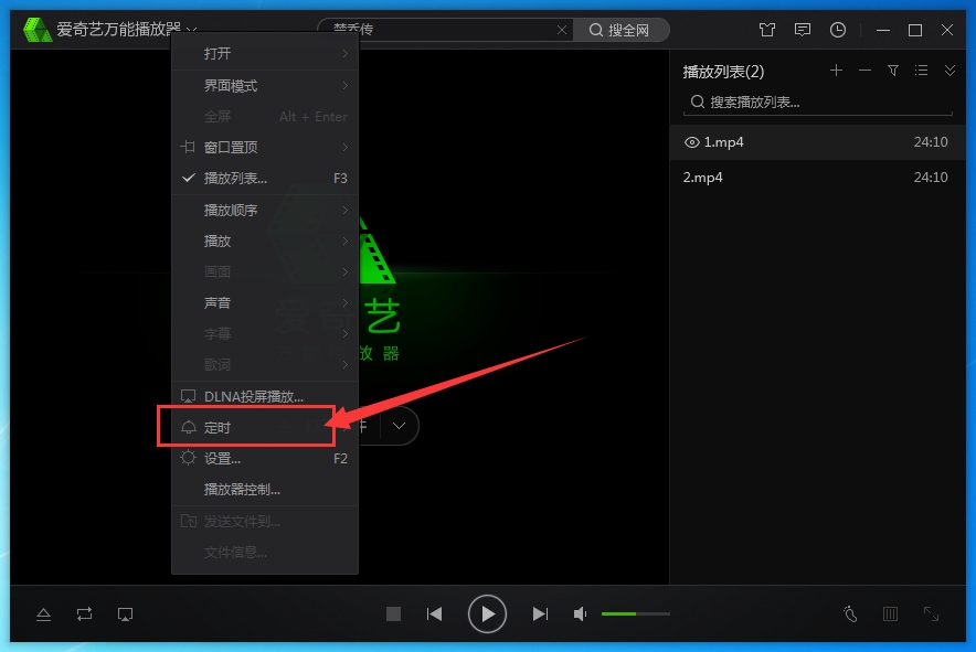1、打开爱奇艺万能播放器,在以下界面点击鼠标右键,在弹出的选项中找到“定时”功能;