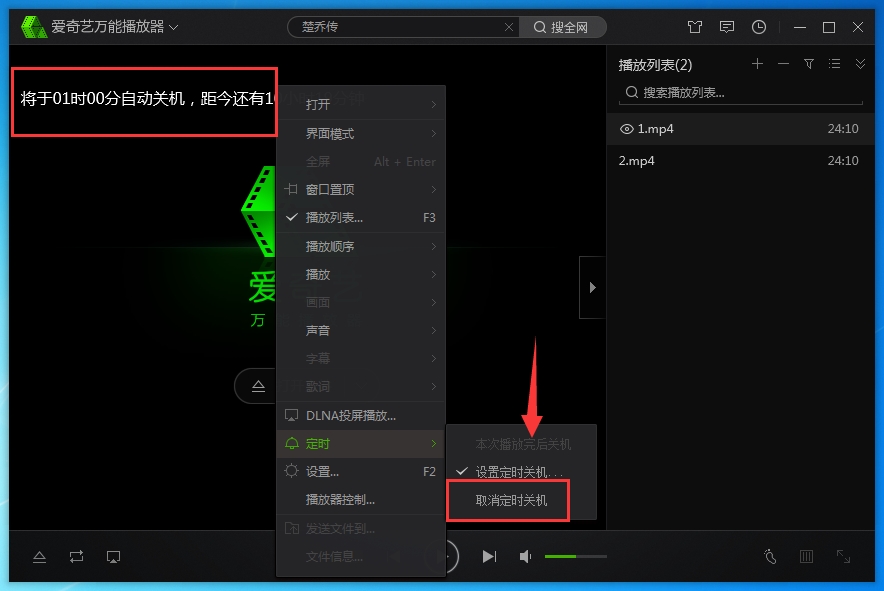 4、点击“设置定时关机”后,需要我们选择关机时间,输入想要关机的时间就可以了。设置成功后在爱奇艺万能播放器界面左上角可以看到距离关机所剩时间。如果想取消的话就在“定时”中点击“取消定时关机”即可。