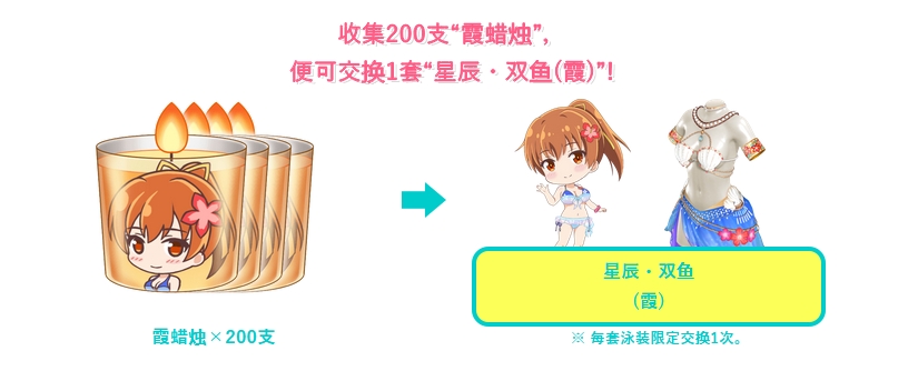 每进行一次“霞的生日扭蛋”,将会附送“霞蜡烛”。您可以在“霞蜡烛特惠兑换处”收集200支“霞蜡烛”,就可以交换一套SSR泳装。