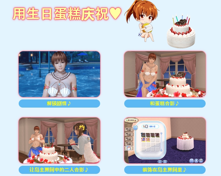 作为礼物送给霞,可以解锁“额外剧情”以及特别“拍摄模式”,同时岛主房间中将新增家具“生日蛋糕(霞)”,以及摄影地点“霞的蛋糕”。