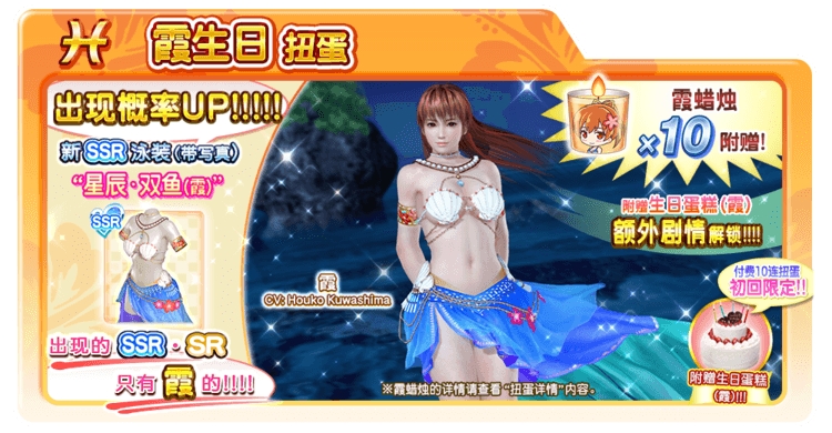 在“霞的生日扭蛋”中,SSR和SR泳装仅限“霞”的专用泳装,而新SSR泳装“星辰・双鱼(霞)”是PICK UP的泳装(※)。
