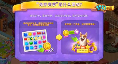 5月21日起,《梦幻家园》将推出全新活动——奇妙赛季。未来的每个赛季都会为家园添加新成员,本期的新宠是萌萌哒柯基!活动期间,成功闯关即可获得积分奖励,通过高难度关卡或者首次闯关成功,都能获得双倍积分。达到规定积分,就能解锁相应等级奖励,道具、体力、金币,甚至是星星,你要的全都有!