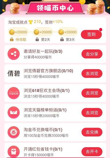 在“领喵币中心”界面,有很多种领喵币的任务,我们可以通过完成这些任务来领取喵币。