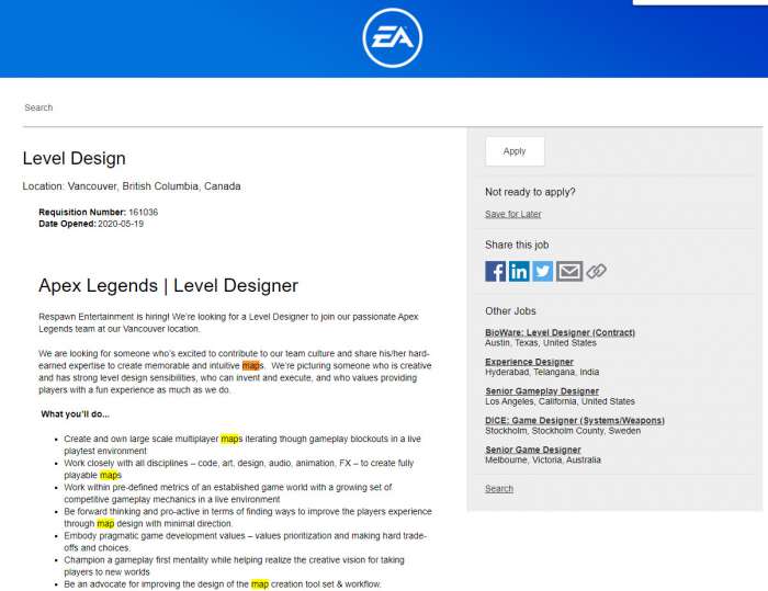 日前EA官网为《Apex英雄》发布了一个“关卡设计师”职位广告,广告中提到重生娱乐正在寻找一名设计师,能创建并拥有大型多人游戏地图,在实时游戏测试环境中通过游戏障碍进行迭代。广告还要求设计师能找到通过地图设计改善玩家体验的方法,要求在这方面具有前瞻性和主动性。