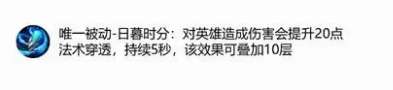 首先就是新增的两件法师装备。 ①【日暮之流】:唯一被动-日暮时分:对英雄造成伤害会提升20点法术穿透,持续5秒,该效果可叠加10层。