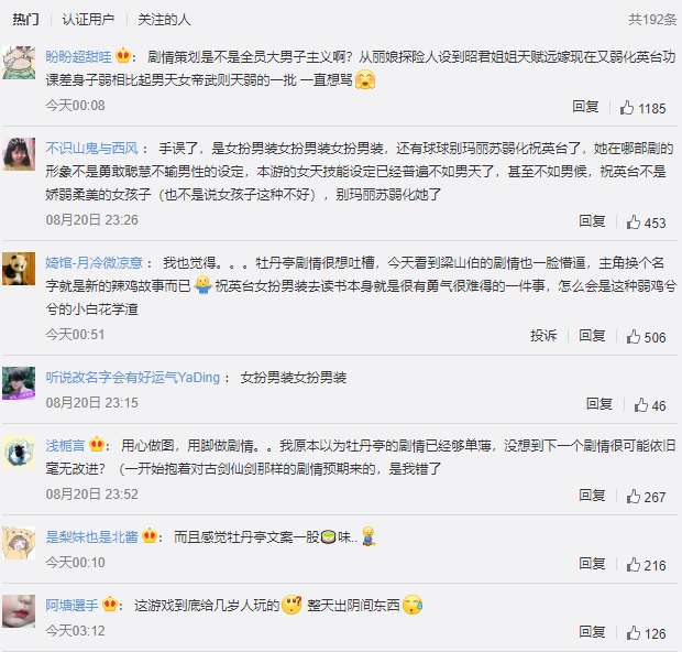 而底下的评论更是直接指出“ 剧情策划是不是全员大男子主义啊?从丽娘探险人设到昭君姐姐天赋远嫁,现在又弱化英台功课差身子弱,相比起男天女帝武则天弱的一批。”