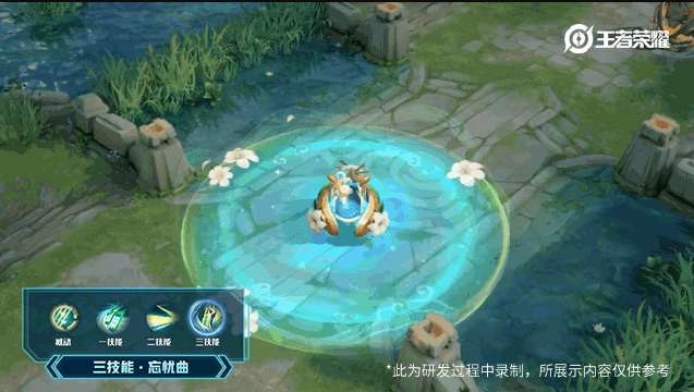【技能特效】丰富了技能特效的表现和氛围,融合了百合花、星空、音符等元素,颜色调整为希腊风的蓝绿色,更加突出皮肤的“繁星”和“吟游”主题。一技能开启时可以看到浪漫的星河流淌;二技能命中后音符会在敌人间回弹,敌人受到了神秘音符的迷惑而眩晕;三技能释放时,蔡文姬身边开出百合花,技能边缘五线谱弹奏出治愈之音
