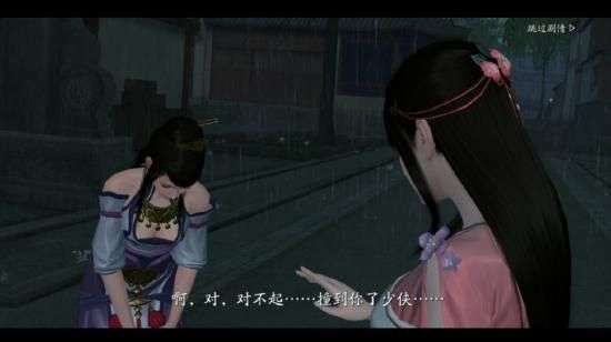 随即我们进入动画,大雨倾落,一位姑娘跑过时撞到了我们,这便是我们此次奇遇的开端,我们劝这位姑娘先去避雨后我们也要来到附近商铺的屋檐下避雨。
