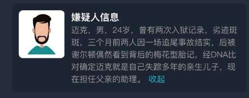 4、迈克,男,24岁,曾有两次入狱记录,劣迹斑斑,三个月前两人因一场追尾事故结实,后被谢尔顿偶然看到背后的梅花型胎记,经DNA比对确定迈克就是自己失踪多年的亲生儿子,现在担任父亲的助理。