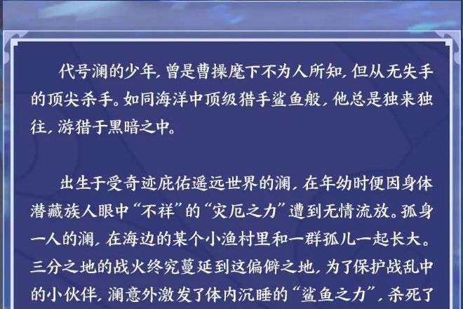 战事频发,澜凭借鲨鱼之力,在混乱战场上总能保住性命。 这个从炼狱般战场中爬出来的孤儿,被曹操看中收养。