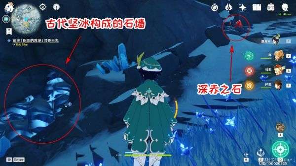沿路线飞进洞穴,就在快要接近任务点时,会看到一面古代坚冰构成的墙,任务点就在墙后,深赤之石也在其不远处,可以轻松拾取并融化。