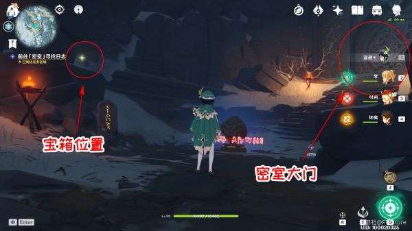 根据小地图指引,来到「密室」所在的位置,具体位置及路线如图所示(任务进行时选择追踪目标会有非常明显的方向以及距离提示,很好找)。