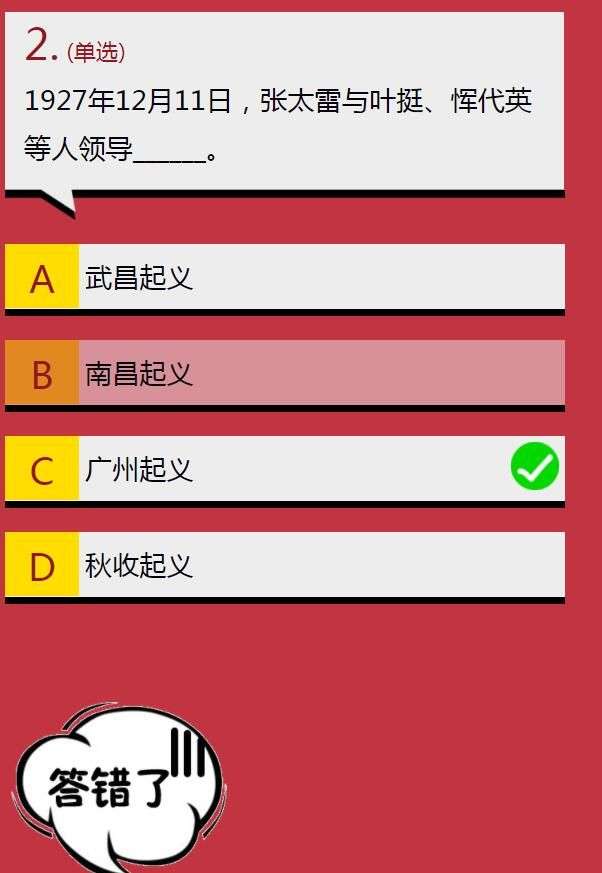 A武昌起义 B南昌起义 C广州起义 D秋收起义 正确答案:C