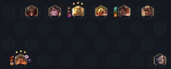 沉底位放两张输出牌,凯尔、莫甘娜。但是并不是绝对这样站位,如果面对刺客,可以前置一些,把阵容采用包裹型站位,放置对手刺客切进来秒人。一般是有坦度的英雄顶前排。