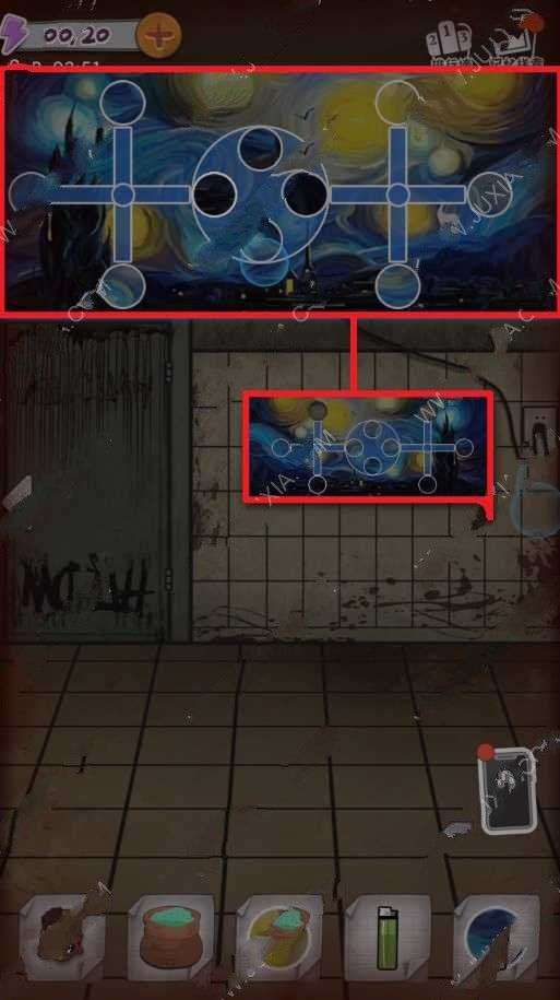 7、来到挂有梵高星空画的地方,点击左上角的柜子放大场景,用物品栏中的“拖把”将柜子上的钥匙拿下来,获得“生锈钥匙”。