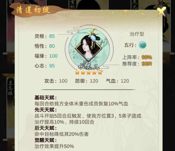 建议优先培养【水灵儿】,其基础天赋可以每回合为己方全体未重伤成员恢复10%气血,觉醒天赋可以提升50%治疗效果,相比较其他治疗类弟子来说,她是回血最多的了。
