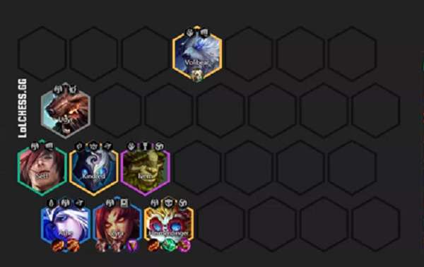 阵容速8以后的搭配主要是以找5费卡大哥为主,这里主要强调两张卡牌狗熊和千珏。狗熊能够主打大团控以及阵容前排,有黑复活甲最佳能够保证开出两次大招造成眩晕,而千珏大招就是R技能能够保护后排不会被瞬间秒掉,而且千珏的狼灵也是有自己技能的。