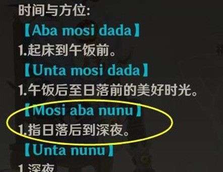 根据丘丘语翻译手册,我们可以查到“Mosi aba nunu”指的是“日落后到深夜”。