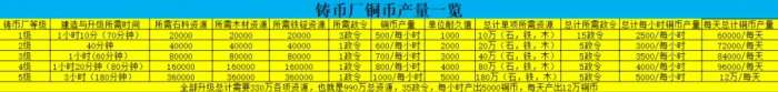 升级5级铸币厂,铜币产出变为1000/每小时,耐久值变为5000。资源需求量变为36万石料,木材,铁锭,以及一个政令。