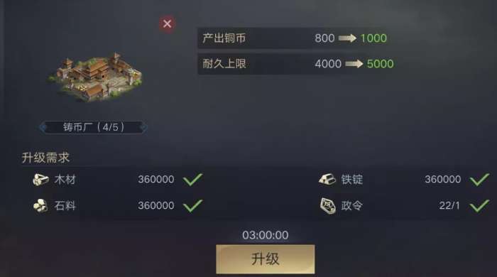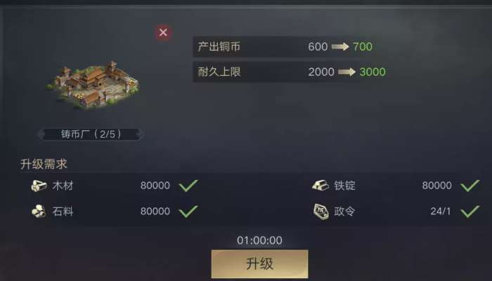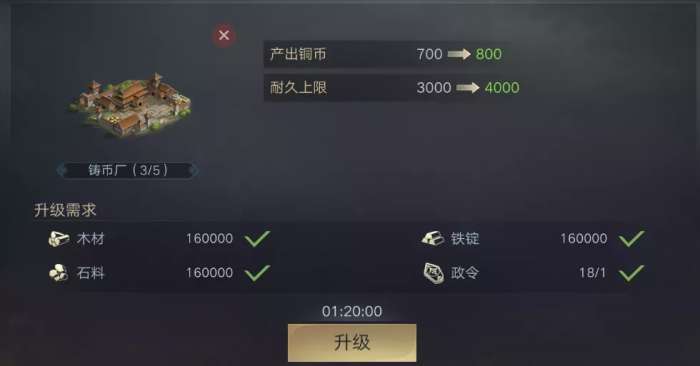 升级5个2级铸币厂则是需要80万石料,木材,铁锭,以及5个政令。升级时间为1个小时20分钟,与初始时间相似。