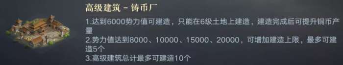 而六级地能建造的建筑为铸币厂,铸币厂则是所有玩家产生铜币最主要的来源之一,也是韬略值产生主要来源之一。