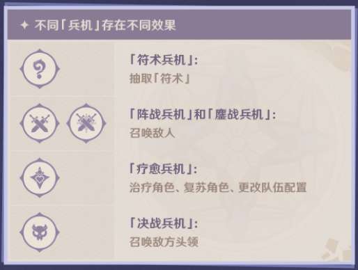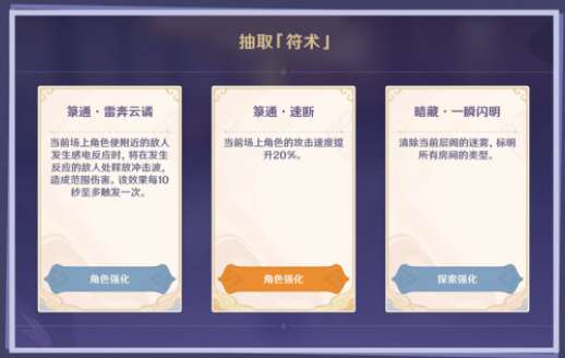 每当完成「阵战兵机」和「鏖战兵机」的挑战,以及完成第一层阁中的「决战兵机」时,旅行者们都可以获得一次抽取「符术」的机会,为战斗提供各种增益。