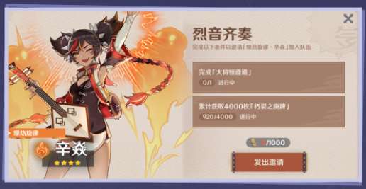 此外,完成「大将恒遵道」任务,并在试炼中累计获取4000枚「朽裂之庚牌」后,可消耗1000个「朽裂之庚牌」邀请「燥热旋律·辛焱(火)」加入队伍(仅可邀请1次)。