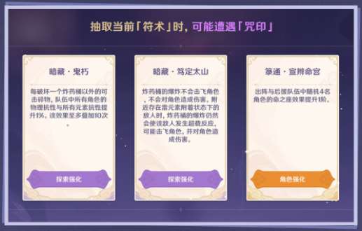 旅行者们也可以在「符术兵机」中抽取「符术」。抽取「符术」时,也有可能遭遇「咒印」,受到相应的负面效果影响。