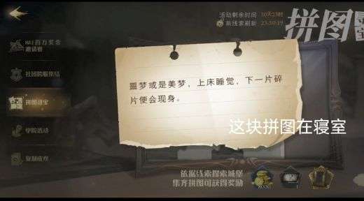 哈利波特魔法觉醒10.23拼图寻宝来了,其中一个提示线索就是噩梦或是美梦,上床睡觉,下一片便会现身,这个具体的位置在哪,下面就来介绍下哈利波特是噩梦或是美梦上床睡觉线索怎么找。