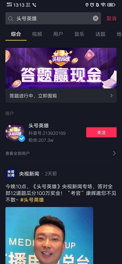 2、之后在搜索框中输入“头号英雄”点击搜索,即可出现许多与头号英雄相关的内容,点击最上面的答题活动进入即可参与答题活动;