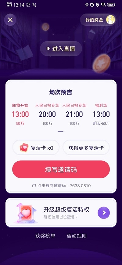 5.如果你持有复活卡,在该场次1-11题回答错误后复活卡会自动使用,你将可以继续参与答题。除升级为超级复活特权以外的用户,每场活动每个用户仅限使用一张复活卡。