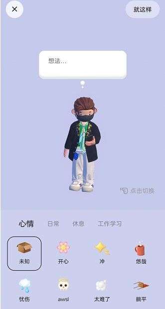 3、之后进入状态编辑界面,在这里分为了心情、日常、休息和工作学习四个分类,每个分类里面都有众多的状态可以选择;