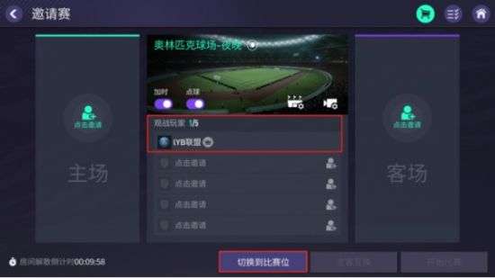进入观察者模式后, 玩家作为邀请者自动落座于观战玩家中,可以邀请主客场各一名玩家,及其余四名观战玩家。与此同时,邀请者也可以切换到比赛位参与比赛。