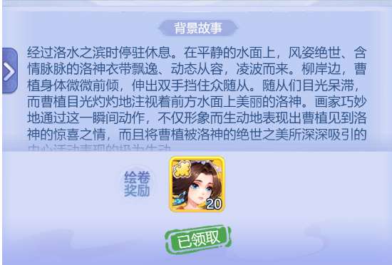 玩家进入洛神降世界面,可在绘卷一获得20个洛神碎片,为绿色品质。