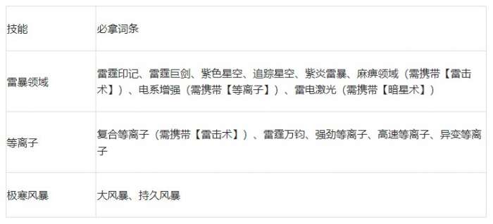 注:核心技能【雷暴领域】至少要升到2级后再使用本流派。若玩家已经解锁了【暗星术】,可用它来替换【极寒风暴】,同时词条必拿【雷电激光】。