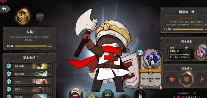 第2个回合骑兵卡牌到手之后,就让骑兵冲在前面,弓箭手弓在后面。第3个回合直接就扔出牛津骑士团,一波就可以带走对手,还可以解锁巨鹰以及用兵术两张新卡。用兵树就可以强化所有的手牌,但是目前会缺少范围性的伤害,因此果断选择巨鹰,范围性攻击在清理小兵时真的还是很有优势的,然后继续推进就会进入到实验室。一个问号事件就会开出哥布林存款,第1波轻骑兵可以去冲路,后面跟一个小步兵补位,直接就可以清空对手的前排。