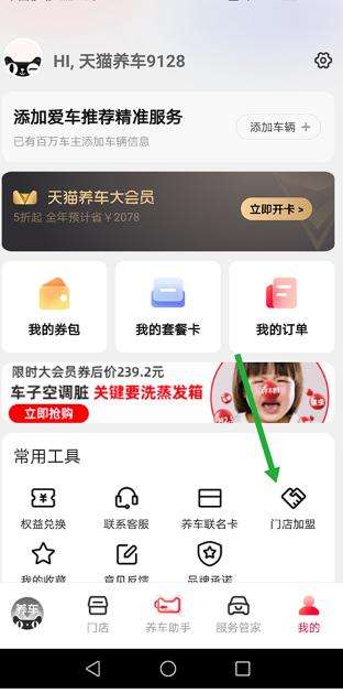 天猫养车app怎么加盟,用户需要进入下载app,点击“我的”,用户需要选择“门店加盟”,并且需要根据提示在线上传资料,用户上传成功了就需要等待平台审核,审核通过了就加盟成功。