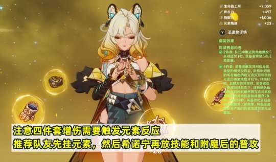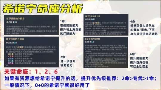 总的来说,希诺宁的重要命座是1、2、6命。如果要给希诺宁(辅助玩法)提供资源进行提升,建议优先提升第2命座,其次是专属武器,再次是第1命座。一般情况下,希诺宁的0+0配置已经足够好用了。