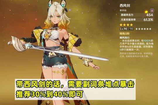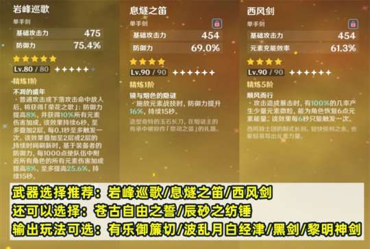 比较推荐的武器有三把:专武岩峰巡歌,副词条加82.7%防御力,特性还能根据防御力给全队额外增伤;纳塔锻造武器息燧之笛,精1就能总共加85%防御力(副词条+特性);西风剑,加快自身和队友充能。