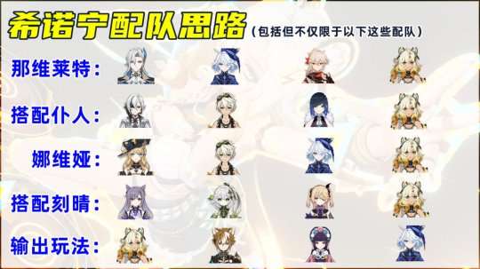 希诺宁可以搭配的输出角色以及配队思路相当多,下面简单列举几种(包括但不仅限于这些配队):搭配那维莱特,配队推荐那维莱特+芙宁娜+万叶+希诺宁;搭配仆人,仆人+班尼特+夜兰+希诺宁;搭配娜维娅,娜维娅+班尼特+芙宁娜+希诺宁;搭配刻晴,刻晴+纳西妲+菲谢尔+希诺宁;输出玩法,希诺宁+五郎+云堇+芙宁娜。