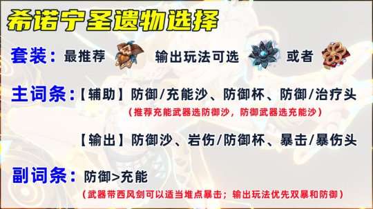 词条方面,辅助玩法主词条推荐:防御/充能沙、防御杯、防御/治疗头;如果是充能武器推荐选防御沙,防御武器的话就选充能沙;输出玩法主词条推荐:防御沙、岩伤/防御杯、暴击/暴伤头。副词条推荐:防御>充能,武器带西风剑的话可以适当堆点暴击;输出玩法优先堆双暴和防御。