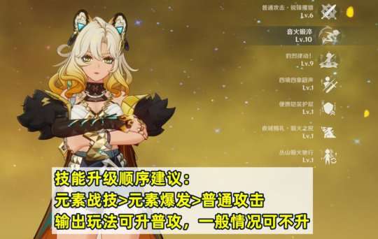 推荐技能升级顺序:元素战技>元素爆发>普通攻击。元素战技最为关键,因为升级能提升希诺宁的减抗幅度。其次是大招,升级能提升希诺宁的的治疗量。普攻的话,站场输出玩法的话可以升级,一般情况下不用升。