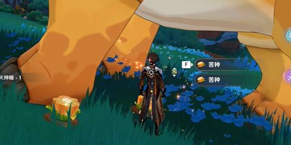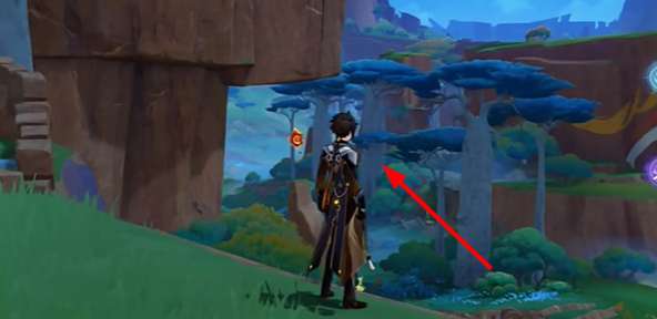 2、接着朝着地图的左侧方向飞过去,可以参考这块石头上有个眼睛,如果玩家已经收集了这个神瞳,也可以看这块石头比较方便。