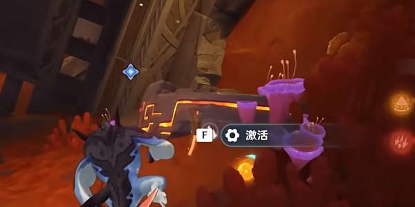 4、然后穿过铁门调查熔浆池中的装置,变身为鳍游龙寻找2处揭露文,返回熔浆池中的装置旁