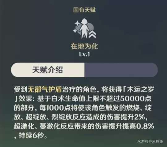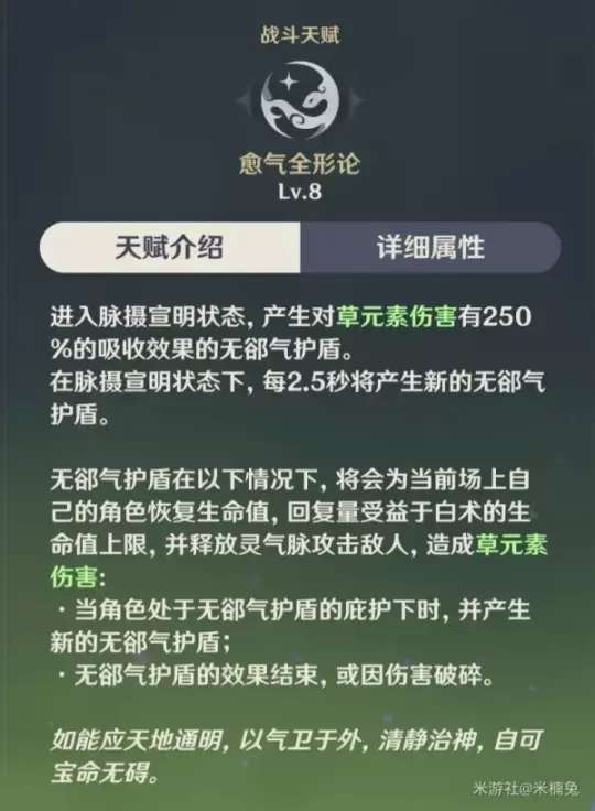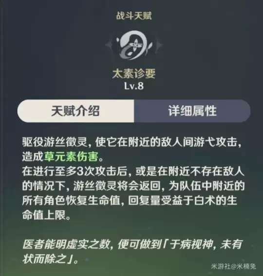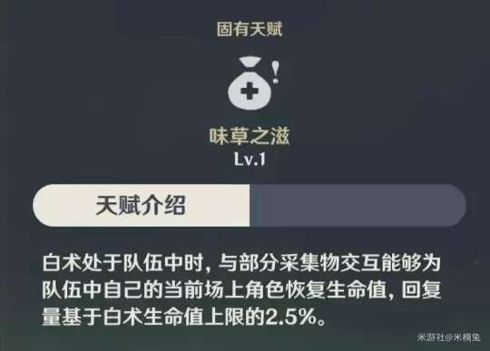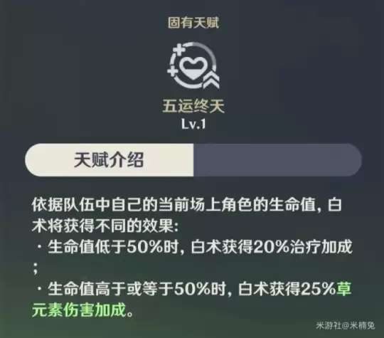 ①根据场上角色的血量判定,血量低于一半,白术获得治疗加成,血量高于一半,白术获得草伤加成