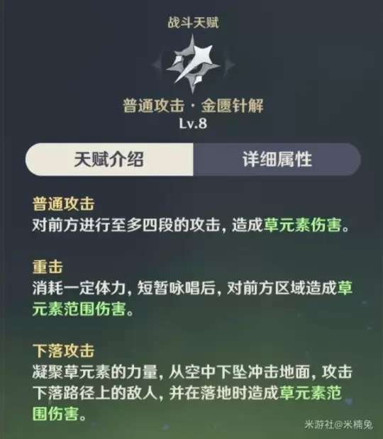 共有四段攻击五次伤害,普攻弱草元素伤害,重击草元素伤害,没有特殊机制,基本不用