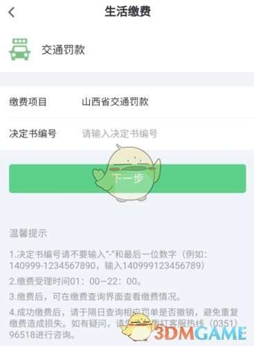 2、在生活缴费页面中,用户输入决定书编号,点击下一步按钮,直接罚款就好了。