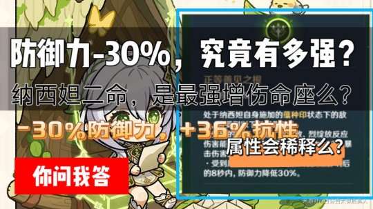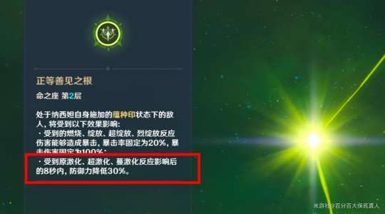 “减防御”手段是非常稀有的辅助能力,就目前版本而言,能减30%防御力的辅助只有纳西妲的二命。